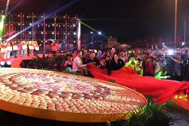 大连金石滩国家旅游渡假区党工委书记、管委会主任柳金红率领度假区管委会领导班子及新区领导一起掀开了“神秘月饼”的红面纱。这个由2019块小月饼拼组成的超级月饼,寓意着无数个小家庭共同汇聚成了祖国大家庭,“我爱我家”,祝愿家庭团圆和美,祖国繁荣昌盛。