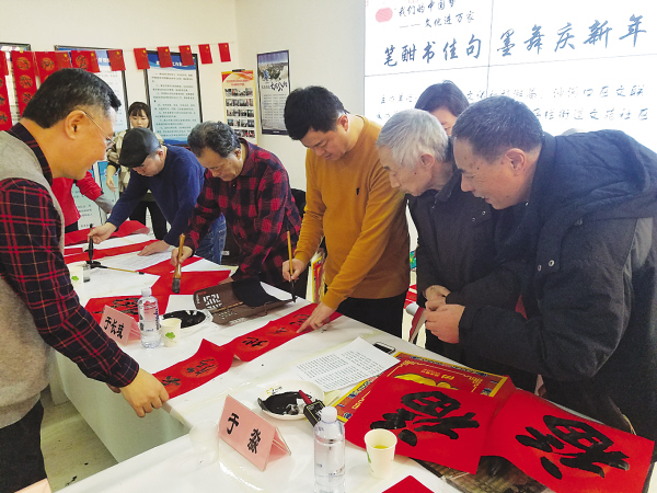 昨天下午,沙河口区书法家协会组织著名林茂芃、于淼、王冬寒、于长琉、高勇等20余名书法家来到马栏街道文苑社区和黑石礁街道红星社区举行“我们的中国梦,文化进万家一一笔酣书佳句,墨舞庆新年”书写春联送“福”字活动。居民们手捧春联和“?!毙朔懿患骸?/div>