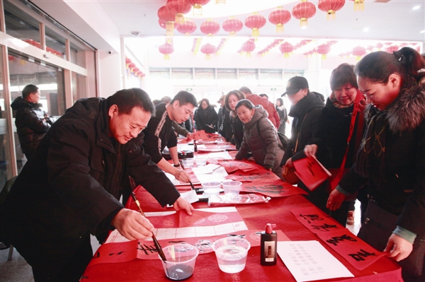 书法家和书法爱好者现场为市民写“福”字和春联,将好运和吉祥送到寻常百姓家。
