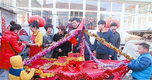 高新区龙王塘渔民们扭起秧歌、放起烟花、挂起旌旗、扎起船型海灯,祈福新年。