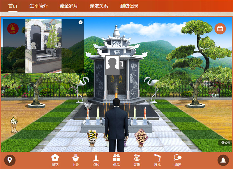 该平台充分照顾到辖区内的各民族在地域、城乡、葬式及安葬设施等习俗差异化的需求,设计出数万种生态场景的组合和种类丰富的祭品,满足民众在平台内的陆上纪念园、海上纪念园、社区公祭园、英模纪念(集体共祭)馆等板块内,几乎完全模拟了实地祭拜的全过程:植树、献花、上香、点蜡、献供品、放生、祈福、散花、献歌、装饰、留言等各种形式的悼念追思礼祭活动,点击鼠标就拖拽到“墓碑”前,可以让人们以环保、身临其境的方式维持传统习俗。