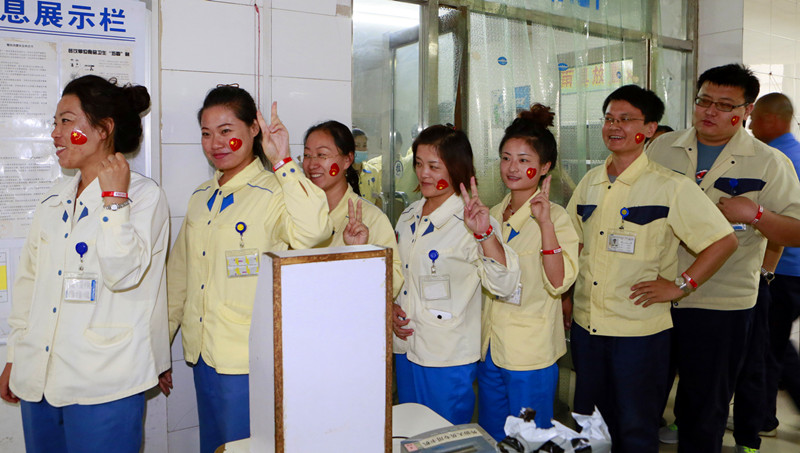 大连市金州新区外企员工国旗贴脸、面带笑容,喜迎国庆。