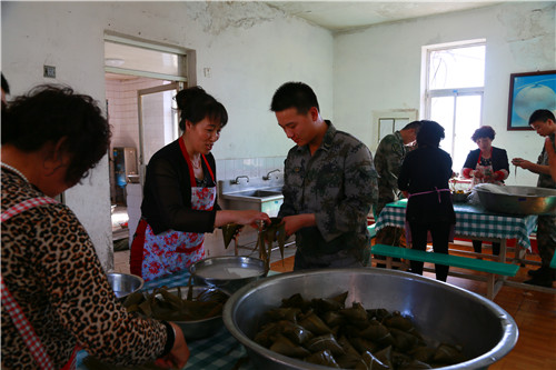 6月5日,西帮村群众听说是给部队官兵包粽子,热情相当高。在海防二连的食堂里,姐妹们热火朝天的忙活着,她们有条不紊地淘米、煮粽叶、包粽子。和连队战士们一道包制“拥军粽子”,食堂里到处充满了欢声笑语。浓浓的节日气氛让这些远离家乡、亲人,驻守在海岛上的战士们感受到了家的温暖。