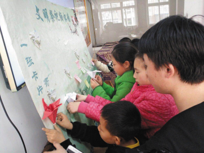 孩子们在祭祀墙上粘贴寄语。(图片来源:大连晚报 摄影:一帆)