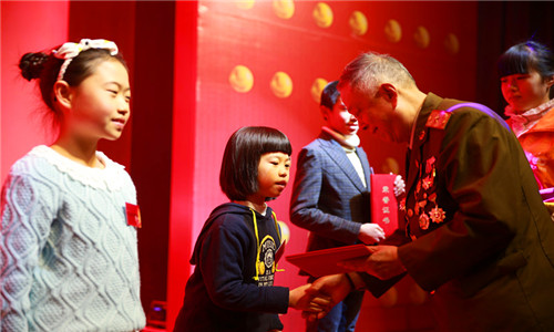 全国关心下一代先进工作者、辽宁省道德模范、老战士报告团团长李光祥将军为大连市美德少年颁奖。