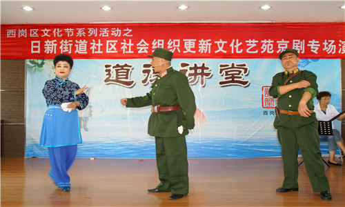 为了纪念抗日战争胜利70周年,丰富市民文化生活,弘扬国粹艺术,文化节期间,日新街道举办了更新文化艺苑红色经典京剧专场演出。更新文化艺苑京剧演员们以现代京剧为主,精彩演绎了红色经典剧目《红灯记》、《智取威虎山》、《沙家浜》等选段,字字铿锵有力、句句有板有眼,让辖区居民在欣赏高雅艺术的同时,重温了先烈英雄事迹,感受幸福生活来之不易,激励居民群众牢记历史、珍爱和平,为实现中华民族的伟大复兴而奋斗。