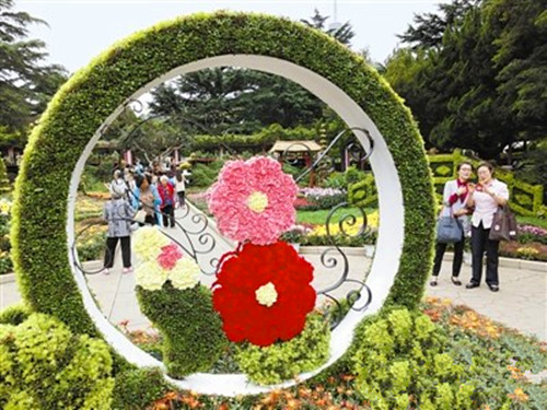 “2015大连金秋精品菊花展”以“花好月圆人团圆,喜庆和谐促发展”为主题,充分展现中国传统的赏菊文化。花展共栽植各种菊花、南方花卉及陪衬花卉总量超过10万株,其中菊花4万余株,品种达到120余个,布展园林小品12组,是历届国庆游园会花卉数量、菊花品种、园林小品最多的一次。