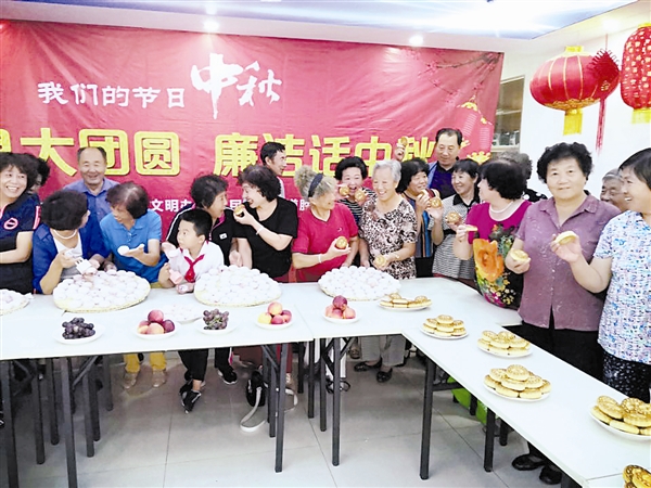 昨日下午,西岗区文明办、人民广场街道廉政文化工作站在胜利社区开展“邻里大团圆 廉洁话中秋”节日同庆活动。邀请街道党风政风监督员、大连好人、科普、平安、红会志愿者等边做月饼边讲清正廉洁、移风易俗故事。活动结束后,大家将“爱心月饼”送到辖区孤寡、残疾、失独家庭等特殊人群手中。 李晶 摄