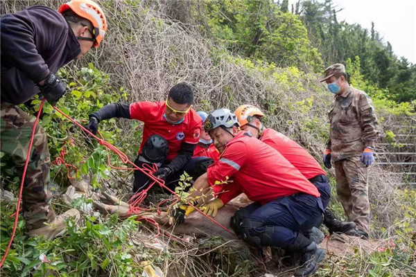 “鹿太重了,岩石旁的路又险又陡,仅容一人通过。几人合力将鹿抬下山崖,但是尽管鹿被捆住四脚,它还是挣扎,一下把我们队员甩向了岩石,幸好只擦破了皮肤。”此次救援,现场有三四人都不同程度受了轻伤。