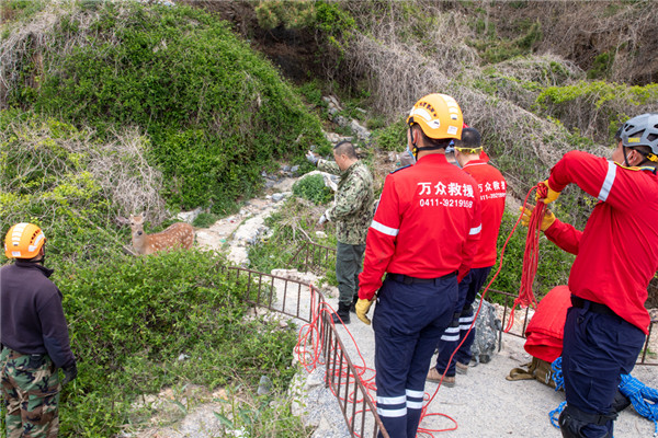 这是一只大约2年生的公鹿,体重约200斤左右,野境自然保护中心随即向大连万众应急救援队求助。万众救援队主城区队队长赵东斌安排多名救援队员携带安全绳等工具赶到现场救援。