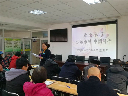 为贯彻落实党的十九大会议精神,广泛深入宣传男女平等基本国策,强化对妇女的法治宣传和维权服务,在庆祝“三.八”国际劳动妇女节108周年之际,黄金社区妇联积极响应区妇联的号召开展以“法治旅顺 巾帼同行”为主题活动,通过开展《妇女权益保障法》系列宣传活动以提高广大妇女的法律意识。