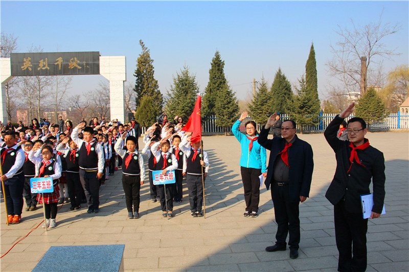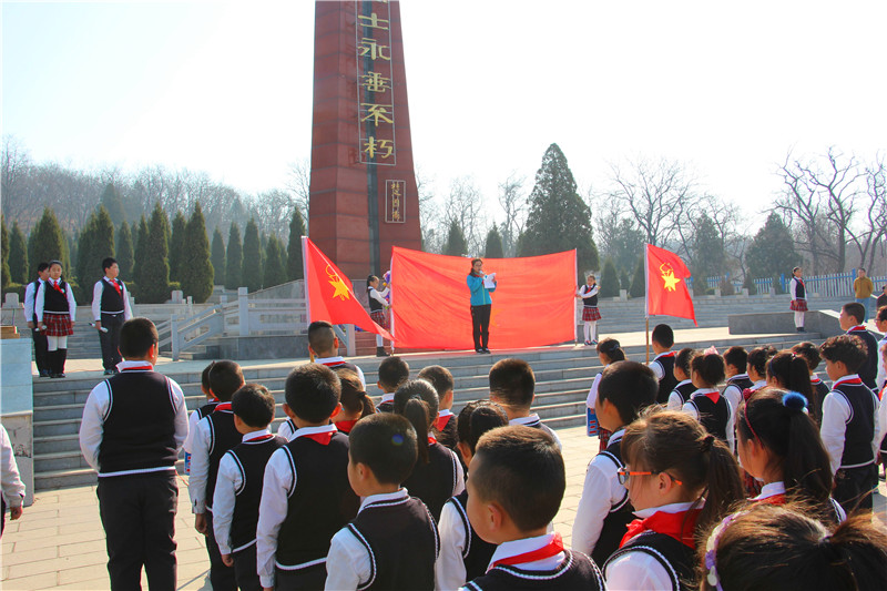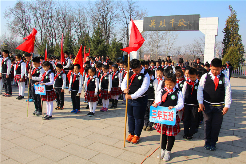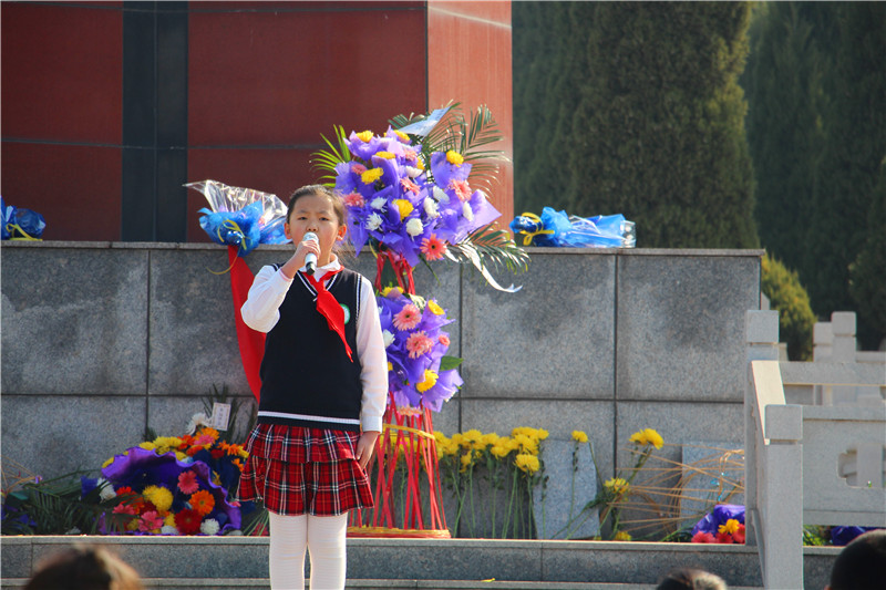 随后,少先队员代表向烈士纪念碑敬献花圈,实验小学和花园小学团队组织负责人向英雄纪念碑深鞠躬并献上小白花。紧接着,主持人带领全体少先队员在烈士碑前庄严宣誓,重温入队入团誓言。少先队员们的誓词回响在烈士墓前,他们将不忘历史,努力学习,尽己所能,不计报酬,帮助他人,服务社会,践行奉献精神,传播先进文化,为构建和谐社会贡献力量。
