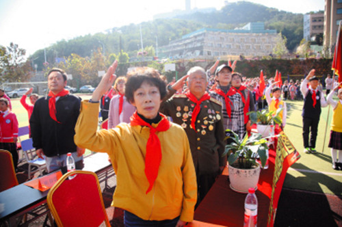 10月17日,大连市西岗区红岩小学300余名师生参加了“喜迎十九大·三代红领巾共绘祖国美好蓝图”主题大队会,应邀出席的几代少先队员,都与红岩小学有缘。第一代少先队员李光祥将军是红岩小学荣誉顾问,是大连市希望工程万帮蓓蕾光祥志愿队的领头人,常年深入红岩小学爱心助学。作为第二代少先队员,西岗区关工委主任王成贤是红岩小学江竹筠(江姐)、宋振中(小萝卜头)英雄中队的创建人和授旗人。大连话剧团国家一级演员夏君是该校优秀毕业生,在学校成立夏君工作室培养艺术人才。他们和新一代红领巾一起,度过了一段美好时光。