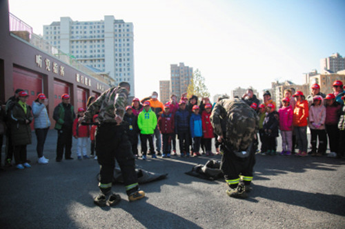 消防战士们在给孩子们演示快速穿衣。(图片来源:大连晚报)