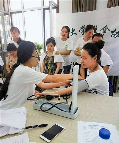 大连大学推拿协会走进社区,为社区居民量血压、推拿。(图片来源:大连日报)