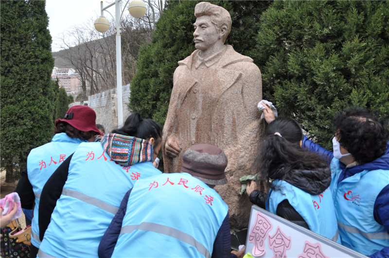 擦洗烈士雕像。(图片来源:新华社区 摄影:张晓卫)