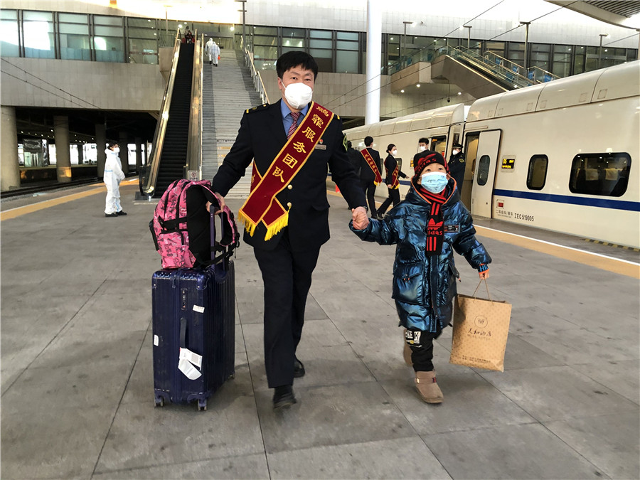 “您好小朋友,叔叔帮您拿行李”1月28日,春运大幕正式拉开,大连客运段“鹏霏服务团队”带头人任鹏霏在站台引导旅客,并帮助旅客拿行李。