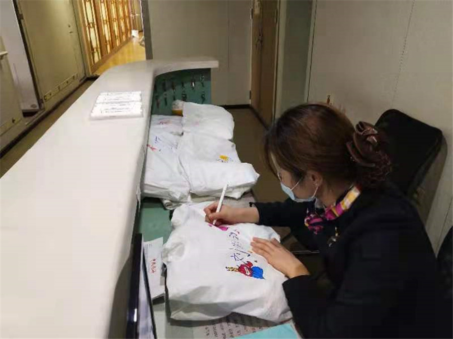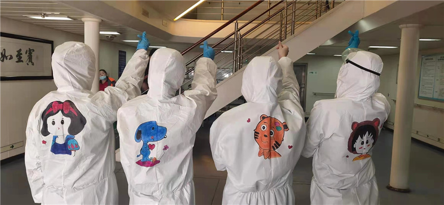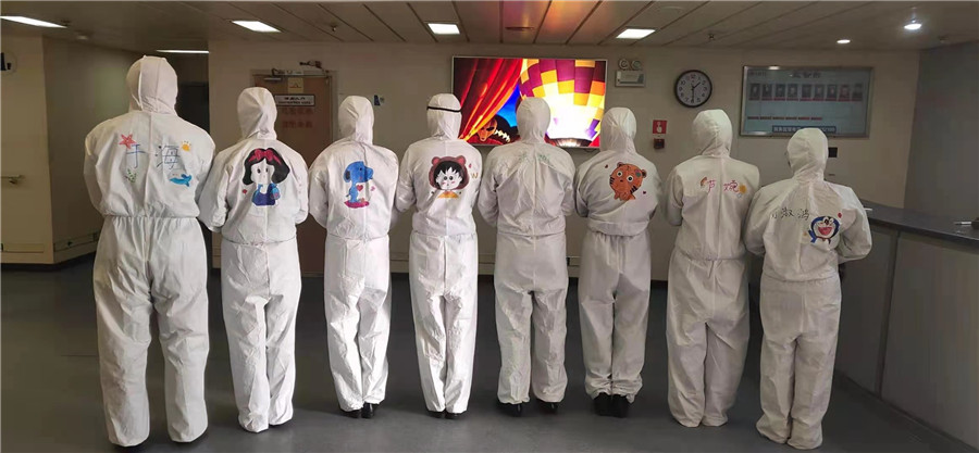 由于穿上防护服后,无法互相认出对方是谁,中铁2号渡船“情满海路”党内品牌的青年团员郝晓丽主动请缨,利用休息时间,将同事们的名字与她热爱的绘画相结合,为每个人的防护服量身定制了手绘图案,携手同心,共战疫情。