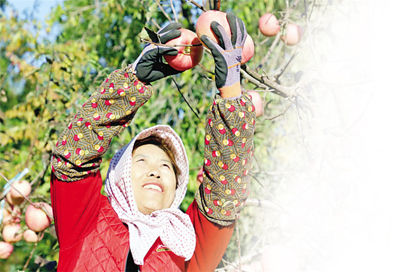 (农民大姐采摘成熟的苹果,沉甸甸的谷穗儿压弯了“腰”。 摄影:战成仁 )