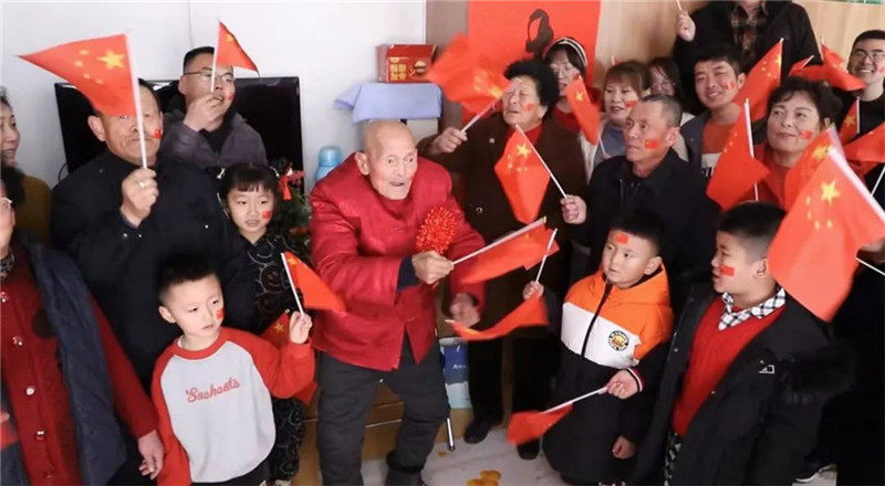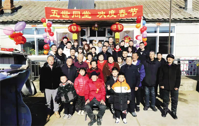 这是金普新区华家街道李沟村李丰章家40多口人,陪着百岁老人李积开一起度过的又一个五世同堂春节。