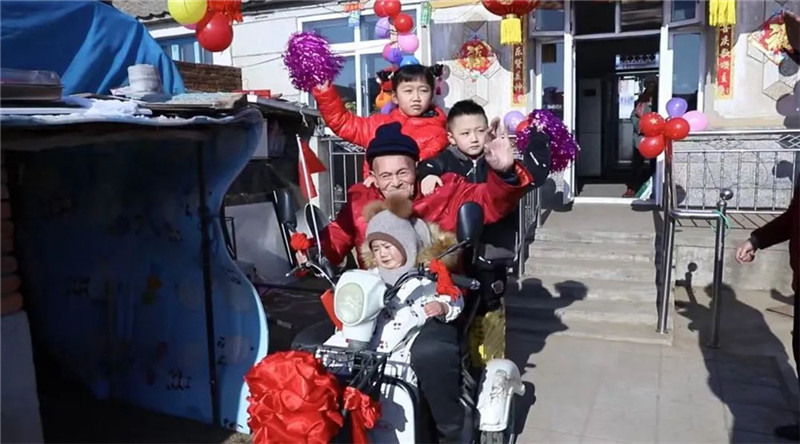 (李积开老人骑着电动三轮车,拉着几个玄孙接受全家人的祝福)